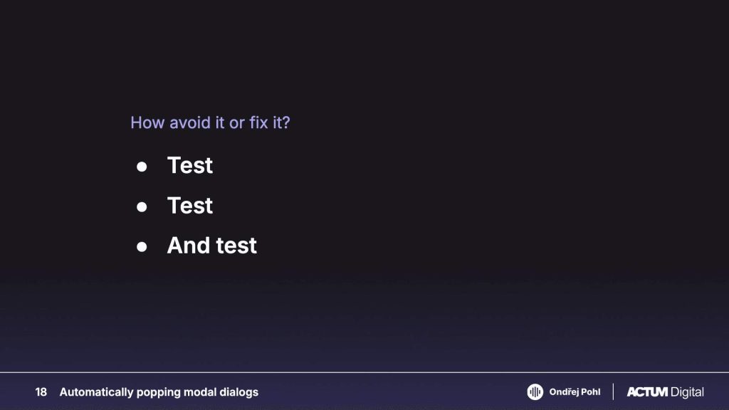 Ondřej then transitioned to discussing specific accessibility mistakes that frequently occur in digital solutions. A major concern he raised was the automatic triggering of modal dialogues. Such elements often interfere with the user experience, as he noted, “It is extremely annoying for everyone”, but for people with visual impairments, this can be exponentially more difficult. These unsolicited interruptions can disrupt the flow of tasks and confuse users, particularly those using screen readers or keyboard navigation.