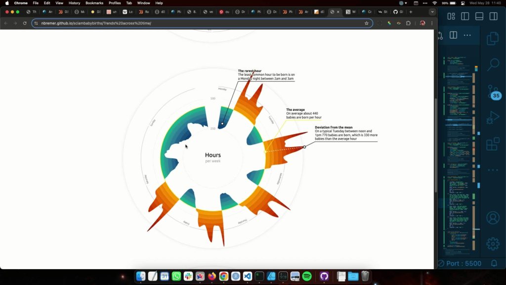 But as pointed out, midnight is “a very… human arbitrary cut in a day”. Since a day repeats, the visual should reflect that cycle. Using polar coordinates, she wrapped the timeline into a circle. “X is the radius times the cosine… and y is the radius times the sine of the angle.” Minutes turned into angles, births into distance from the centre, and the chart snapped into a rhythm that matched how we experience time.