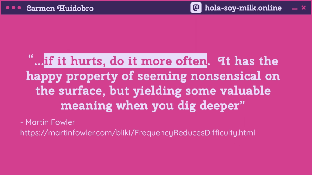 One of Carmen’s favourite ideas is the bleeding edge branch. She explained, “I love version control… the bleeding edge branch… make a big, big mess, nothing compiles.” This experimental branch lets developers test wild ideas safely. You can break everything, then trace back what works. It’s a method that celebrates curiosity and iteration, echoing Martin Fowler’s advice: “If it hurts, do it more often.”